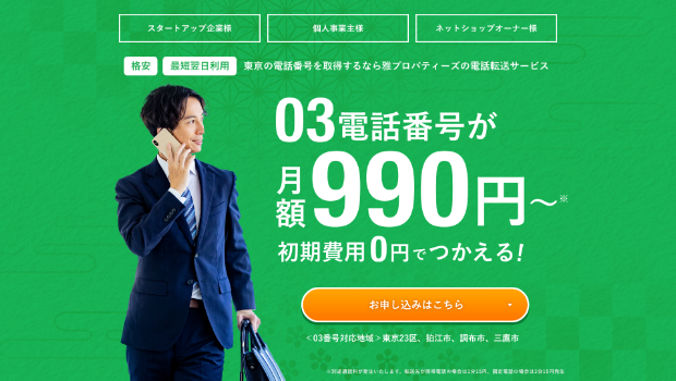 (4)弊社からお客様に貸与する電話番号(電話番号の局番03番、以下「弊社電話番号」といいます。)を使用するに当たり、お客様の所在する住所が、東京都23区、狛江市、調布市、三鷹市以外である場合。なお、弊社バーチャルオフィスを申込みのお客様は、この条項に該当いたしません。